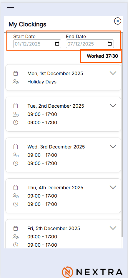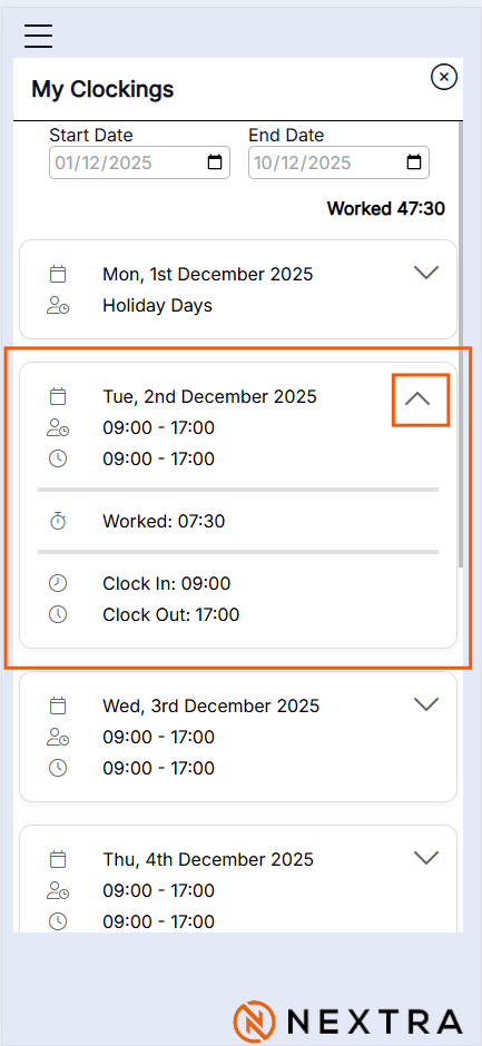 NB; Click the expand arrow to view details of the clock-in | out times and the duration of hours worked
