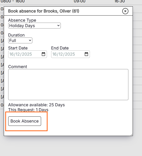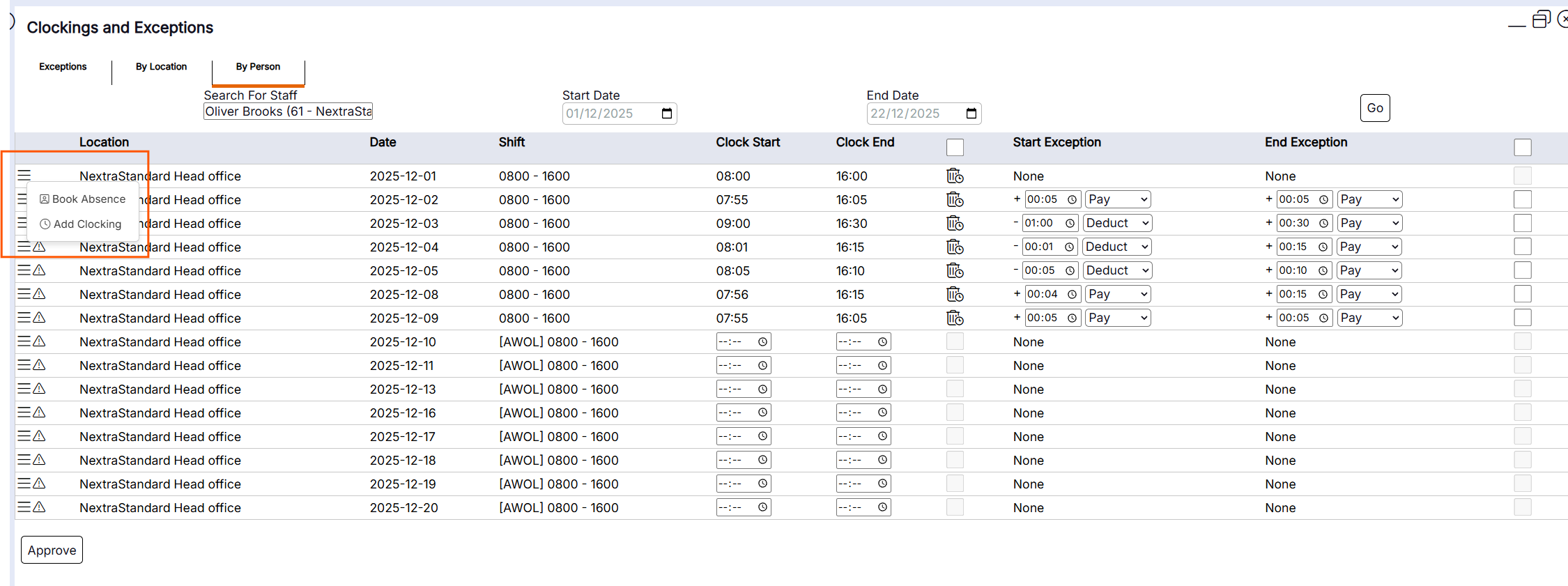 An absence can be added through the exceptions tab, By Location tab & By Person tab, the process is the same on all.